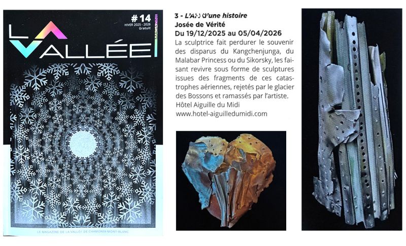 Triple drame, où une nouvelle fois la montagne a pris des vies. Mais elle n’est pas voleuse. La neige en deuil, évoquée par Henry Troyat, a progressivement rendu les restes de ces tragédies dans le glacier des Bossons. Archéologue amateur, j’ai grimpé, j’ai exploré, fureté, fouiné pour excaver le cœur battant, ces morceaux de tôle déchirés qui me « parlaient » de leur histoire. Je les ai transportés souvent avec grande difficulté et toujours avec émotion. Artiste plasticienne, j’ai voulu rendre ces vestiges à la vie par leur transfiguration artistique. Ces tôles tordues, pliées, compressées, sont devenues ainsi un lien entre les tragédies passées et le vivant de l’art contemporain. Je les ai écrasées, comme elles le furent contre la montagne, avec une énergie créatrice. Puissiez-vous, en méditant sur ma composition, vous imprégner de cette déchirante continuité de l’existence.
